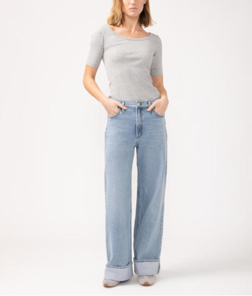 - Wide leg jeans in a medium-light indigo wash